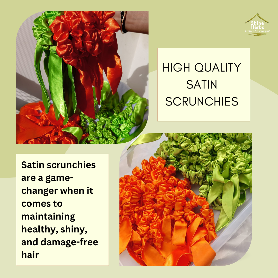 Available in Orange and Green Colors. Shine Herbs High Quality Satin Scrunchies are a game-changer when it comes to maintaining healthy, shiny, and damage-free hair. By reducing friction, preventing breakage, and protecting your hair, satin scrunchies offer a range of benefits that traditional elastic hair ties simply can’t match.